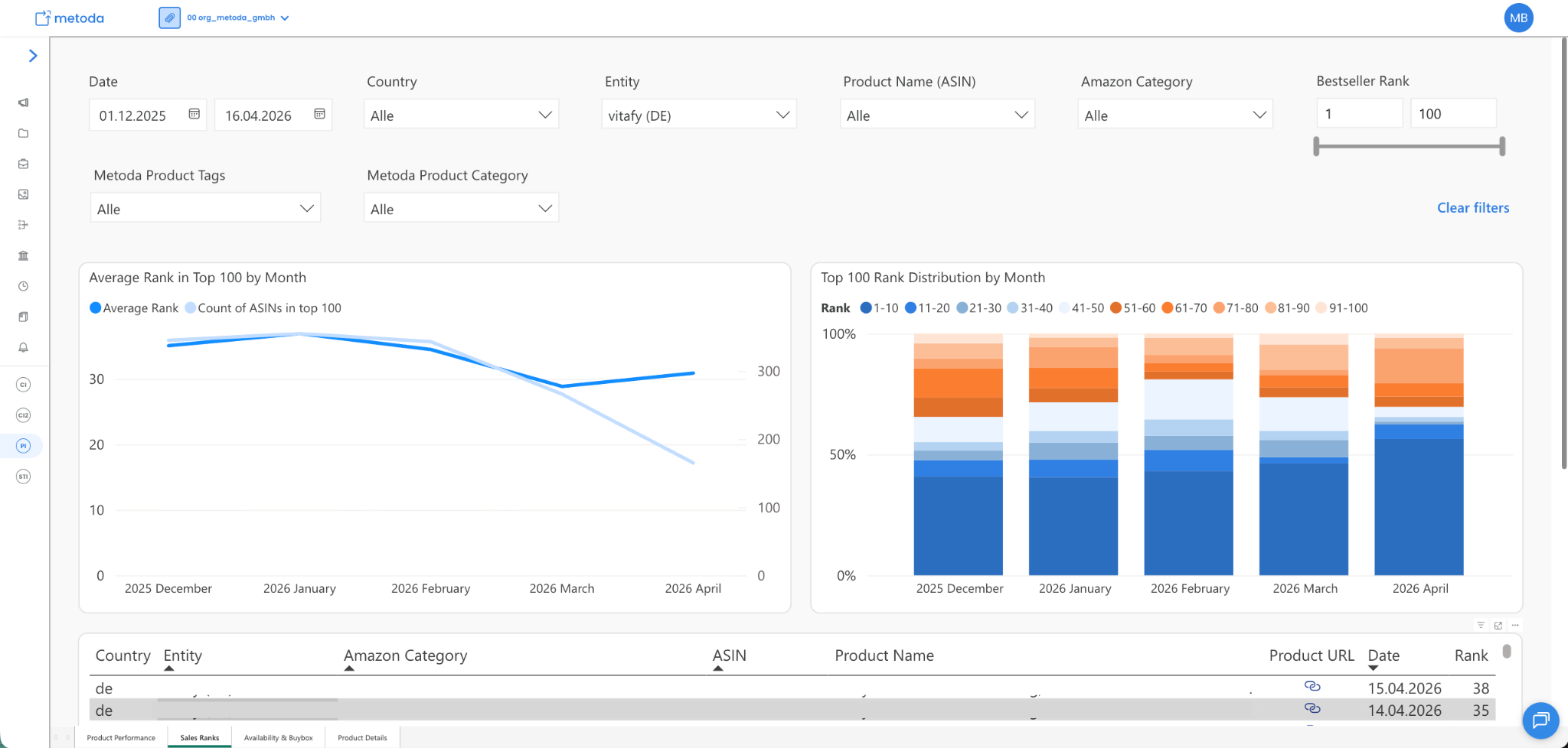 The Average Sales Rank by Month chart shows how your average bestseller rank develops over time. A second axis displays how many of your ASINs are ranking within the Top 100 per month, so you can track both ranking quality and breadth at a glance.
